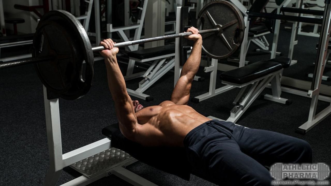 - Жим штанги лежа на горизонтальной скамье;