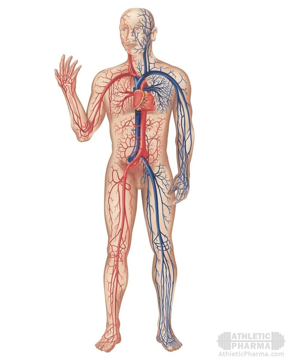 Кровеносная система – артерии, вены и капилляры – обеспечивает транспорт кислорода, питательных веществ, гормонов и клеток иммунной системы по всему телу. Артерии несут насыщенную кислородом кровь от сердца к органам и тканям, а вены возвращают обедненную кислородом кровь обратно к сердцу. К слову, во время интенсивной силовой тренировки, стимулирующей так называемый “памп” (мышечная накачка), вены расширяются и смещаются ближе к поверхности кожи, для того чтобы обеспечить необходимый объем обратного тока крови к сердцу.