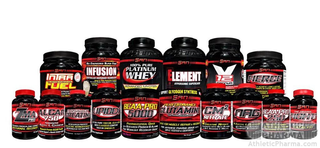 Если говорить об ассортименте SAN Nutrition в целом, то компания выпускает аминокислоты и комплексы BCAA (например Intra Fuel, представляющий собой концентрат аминокислот, или соответственно BCAA Pro Reloaded с добавлением глютамина для быстрейшего восстановления), витаминно-минеральные комплексы (обратите внимание на универсальный DR. Feel Good), гейнеры (Mass Effect Revolution и другие), креатин (часто встречал их Performance Creatine) и, конечно, протеин в большом выборе (от известных Fusion до Titanium).