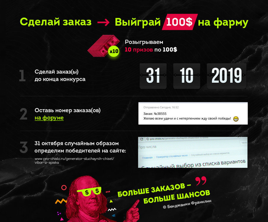 Приветствую Всех, Братишки! Что-то давно не было конкурсов у нас Запускаем КОНКУРС ЗАКАЗОВ #3, где разыграем 10 призов по 100$ Условия конкурса: делаете заказ(ы) в нашем магазине: https://AthleticPharma.shop оставляете номер заказа(ов) в этой теме (полностью оплаченный(ые)) Период проведения конкурса: с 09 сентября 2019г 00:00 по 31 октября 2019г 22:00 (по Москве) ВАЖНО: участвуют заказы, оформленные в данный период времени, и оставившие номер заказа в теме в тот же период времени Условия проведения розыгрыша: 31 октября 2019 года в 23:00 (по Москве) начинаю запись видео розыгрыша фиксирую время по сайту: https://time.is/Moscow (демонстрирую время на сайте) заранее подготовленный список заказов вставляю в поле "Варианты (по одному на строке)" на сайте с генератором случайных чисел: http://pro-chislo.ru/generator-sluchaynih-chisel/vibor-iz-spiska медленно прокручиваю список, чтобы все могли проверить, есть ли там ваш номер заказа выставляю кол-во мест 10 жму "выбрать" получаем сразу 10 призовых мест (абсолютно рандомно, поэтому один участник может занять несколько мест) заливаю видео на Форум в эту тему Призовые места и призы (10 призов по 100$): 1 место - 100$ 2 место - 100$ 3 место - 100$ 4 место - 100$ 5 место - 100$ 6 место - 100$ 7 место - 100$ 8 место - 100$ 9 место - 100$ 10 место - 100$ У нас коммунизм! Призы одинаковые, чтобы никто не обижался Как получить приз: со всеми победителями мы связываемся через личные сообщения на Форуме уточняем ваш логин(емайл) в магазине добавляем выигранные средства на баланс в магазине https://athleticpharma.shop Бонус для Консультантов и Модераторов: помимо заказа(ов) Вы можете участвовать в конкурсе, просто оставив свой Ник в этой теме Всем удачи22 балла