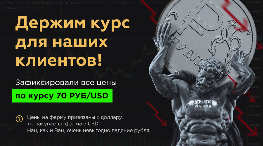 Друзья, курс рубля падает Не смотря на падение рубля, мы держим КУРС НИЖЕ РЫНКА для Вас. Мы зафиксировали курс доллара на сайте — 70руб за 1$, хотя сами покупаем валюту намного дороже на обменниках (сейчас курс 80-83руб за 1$: www.bestchange.ru). Вся фарма закупается за доллары, поэтому цена и привязана к USD. ПОКА можем — будем удерживать этот курс! ? О нестабильности рубля Рубль зависит от цены на нефть. Вы сами видите, что нефть демпингуют, поэтому неизбежно мы увидим курс в 80-90-100 рублей... Вопрос времени. Ситуация на всех финансовых рынках очень нестабильная (фондовые рынки валятся, коронавирус парализует экономику — даже золото падает в цене), поэтому не стоит надеяться на возврат курса (это наше мнение, не финансовая рекомендация). Нам, как и Вам, очень не выгодно такое положение дел. ? Как сохранить свои деньги при падении рубля 1. Покупать по старым ценам Пока мы держим цены, лучше покупать СЕЙЧАС по самому выгодному курсу. 2. Пополнить баланс по курсу 70руб за $1 Если Вы планировали купить фарму позже, то для Вас есть хорошее предложение: Вы можете перевести рубли на баланс в магазине по выгодному курсу 70руб за 1$. Баланс в вашем аккаунте фиксируется в долларах, поэтому рост цен в рублях Вас не коснётся. ✍️ Для пополнения баланса обращайтесь на емайл к менеджеру: AthleticPharma@gmail.com18 баллов