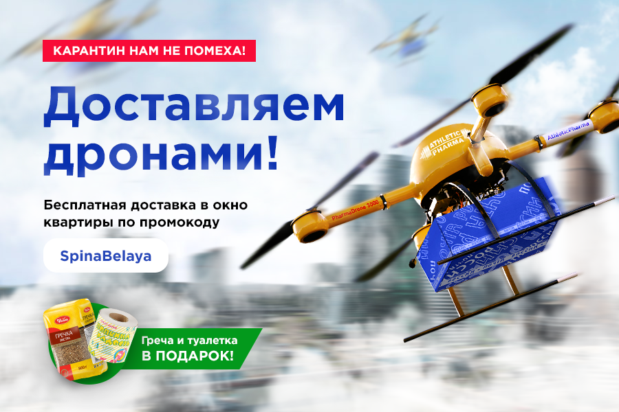 Друзья! Мы, также как и Вы, оказались в зоне карантина и изоляции. Ситуация правда сложная. И если с домашними тренировками и нагрузками все более-менее разобрались и нашли схему как не растерять свою форму... Как же быть с фармподдержкой, когда не дойти до почты, а на улицах вот-вот введут комендантский час? Современные проблемы требуют современных решений! AthleticPharma запускает ДОСТАВКУ ДРОНАМИ — получайте фарму прямо в окно своей квартиры! Но это ещё не все! Мы не были бы собой, если бы на этом хорошие новости закончились. Каждому клиенту мы дарим БЕСПЛАТНЫЙ набор: 5кг гречи и 4 рулона туалетки. Доставка дронами по промокоду: SpinaBelaya Берегите себя и своих близких!8 баллов