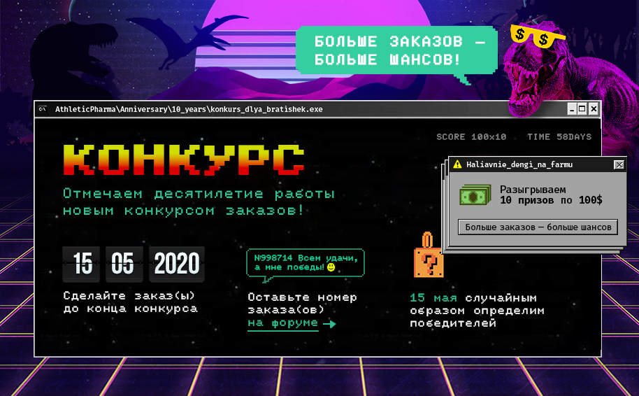 Друзья, в честь Юбилея — 10 лет, мы запускаем этот конкурс! КОНКУРС ЗАКАЗОВ #4, где разыграем 10 призов по 100$ Условия конкурса: делаете заказ(ы) в одном из наших магазинов: https://AthleticPharma.xyz или https://BelSteroid.org оставляете номер заказа(ов) в этой теме (полностью оплаченный(ые)) Период проведения конкурса: с 18 марта 2020г 00:00 по 18 апреля 2020г 22:00 (по Москве) 15 мая 2020г 22:00 (по Москве) ВАЖНО: участвуют заказы, оформленные в данный период времени, и оставившие номер заказа в теме в тот же период времени Условия проведения розыгрыша: 15 мая 2020 года в 23:00 (по Москве) начинаю запись видео розыгрыша фиксирую время по сайту: https://time.is/Moscow (демонстрирую время на сайте) заранее подготовленный список заказов вставляю в поле "Варианты (по одному на строке)" на сайте с генератором случайных чисел: http://pro-chislo.ru/generator-sluchaynih-chisel/vibor-iz-spiska медленно прокручиваю список, чтобы все могли проверить, есть ли там ваш номер заказа выставляю кол-во мест 10 жму "выбрать" получаем сразу 10 призовых мест (абсолютно рандомно, поэтому один участник может занять несколько мест) заливаю видео на Форум в эту тему Призовые места и призы (10 призов по 100$): 1 место - 100$ 2 место - 100$ 3 место - 100$ 4 место - 100$ 5 место - 100$ 6 место - 100$ 7 место - 100$ 8 место - 100$ 9 место - 100$ 10 место - 100$ Как получить приз: со всеми победителями мы связываемся через личные сообщения на Форуме уточняем ваш логин(емайл) в магазине добавляем выигранные средства на баланс на https://AthleticPharma.xyz или выдаем промокод на сумму для https://BelSteroid.org Бонус для Консультантов и Модераторов: помимо заказа(ов) Вы можете участвовать в конкурсе, просто оставив свой Ник в этой теме Всем удачи, Друзья24 балла