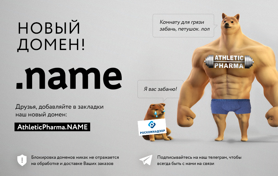 Друзья, мы переехали на новый домен — AthleticPharma.XYZ Силы зла заблокировали старый домен на территории РФ, но мы продолжаем работать, и эти блокировки никак не влияют на обработку и доставку Ваших заказов. И в очередной раз напоминает о том, что всегда нужно пользоваться VPN — в 2020г. в России это совсем не прихоть, а ваша безопасность и комфорт. Инструкцию, как пользоваться VPN и обходить блокировки мы уже публиковали ранее. Мы всегда доступны в Tor: http://athleticdvjcx5ca.onion/ (используйте Tor браузер) Подписывайтесь на наш телеграм-канал, чтобы первыми узнавать о всех новостях и иметь доступ к подаркам и скидкам только для подписчиков канала: https://t.me/athleticpharma_shop11 баллов