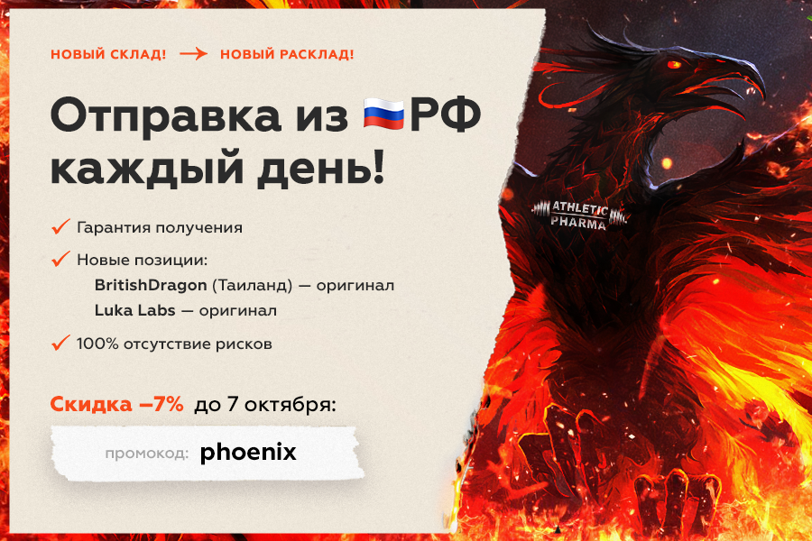 Друзья, наш магазин возобновил работу! Надеемся, что многие остались с нами и дождались возобновления работы! Это было непростое время! Пули свистели над головой и нам пришлось залечь на дно. Мы справились со всеми трудностями и вернулись к работе! Сейчас у нас новый прайс и новые условия доставки! Очень быстро и очень безопасно! ОТПРАВКА из России КАЖДЫЙ день! Никаких задержек и ожиданий отправки! Заказали — 1-2 дня и заказ идет к Вам! В наличии: British Dragon Pharmaceuticals (Таиланд) — оригинал с кодами Lyka Labs — оригинал с кодами позиции европейских брендов (аптека) Выбор пока не большой, но зато широкий ассортимент веществ и всё есть в наличии! А главное, — рабочая проверенная фарма. Работаем над пополнением склада другими брендами! Ну и конечно, промокод -7% на ВСЁ : Phoenix действует до 7 октября!19 баллов