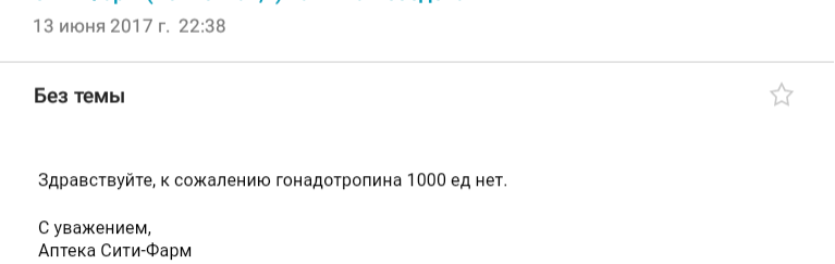 Заказал в аптека.ру на сайте доставка в аптеку,гонады опять нету на сайте,Гонадотропин,Анастрозол каберголин кломид,актрапид нм ,и ещё кое какие мелочи,тесто там нету в этом минусы аптеки,главное чтобы не потребовали рецепт а то в одной аптеке требовали на кломид и инс