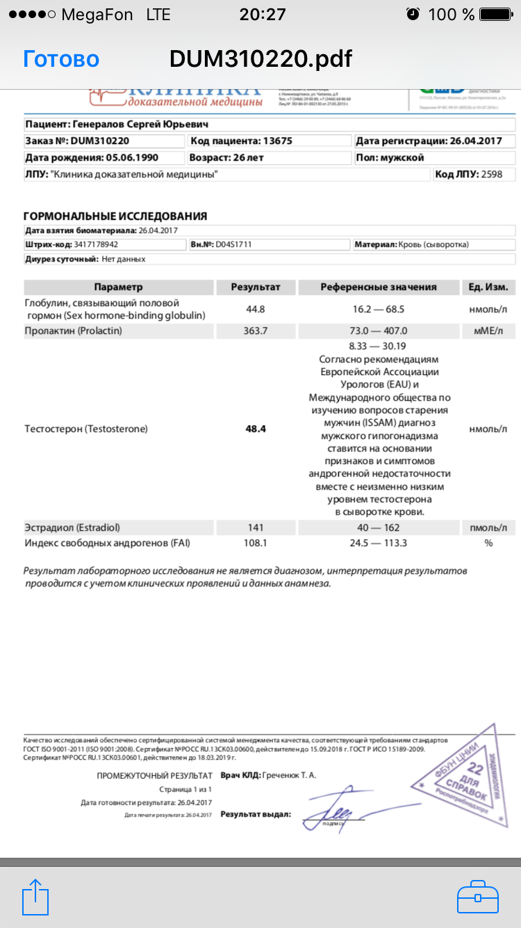 Ты ничего не жрешь щас? Тест высокий какой то)  И еще можно слегка сбить Пролактин один раз выпить 0,25 мг Берголака