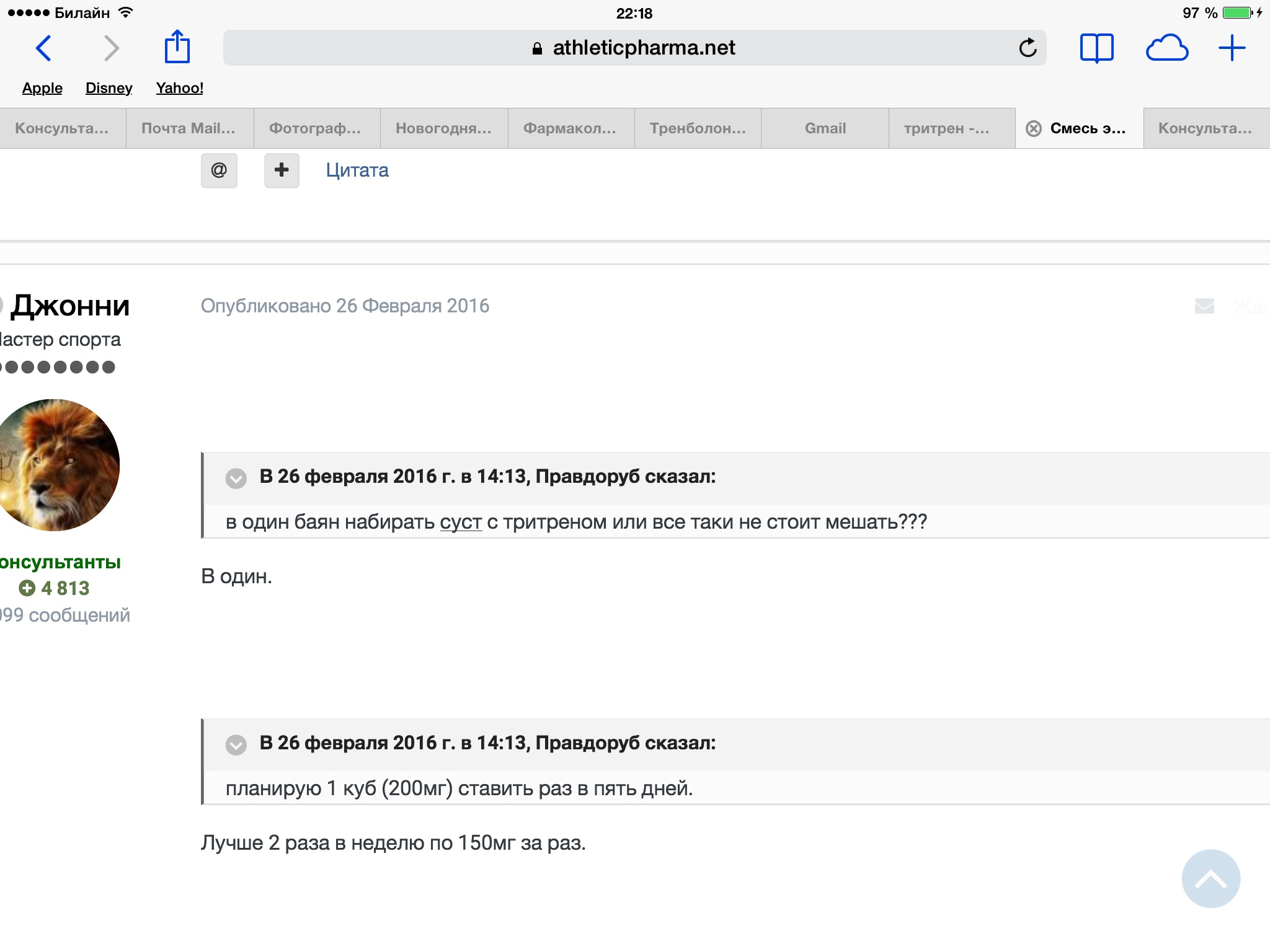 Перед тем как задуматься о тритрене, прочитал ветку о нем. Наткнулся на реплику Джонни, думал можно обойтись двумя уколами в неделю. Думаю 525 трена и 875 суста в неделю для меня  пока слишком большие дозировок, да и выработать  это сложно.так что  видимо тритрен пока подождет, думаю до осени. За информацию спасибо)))