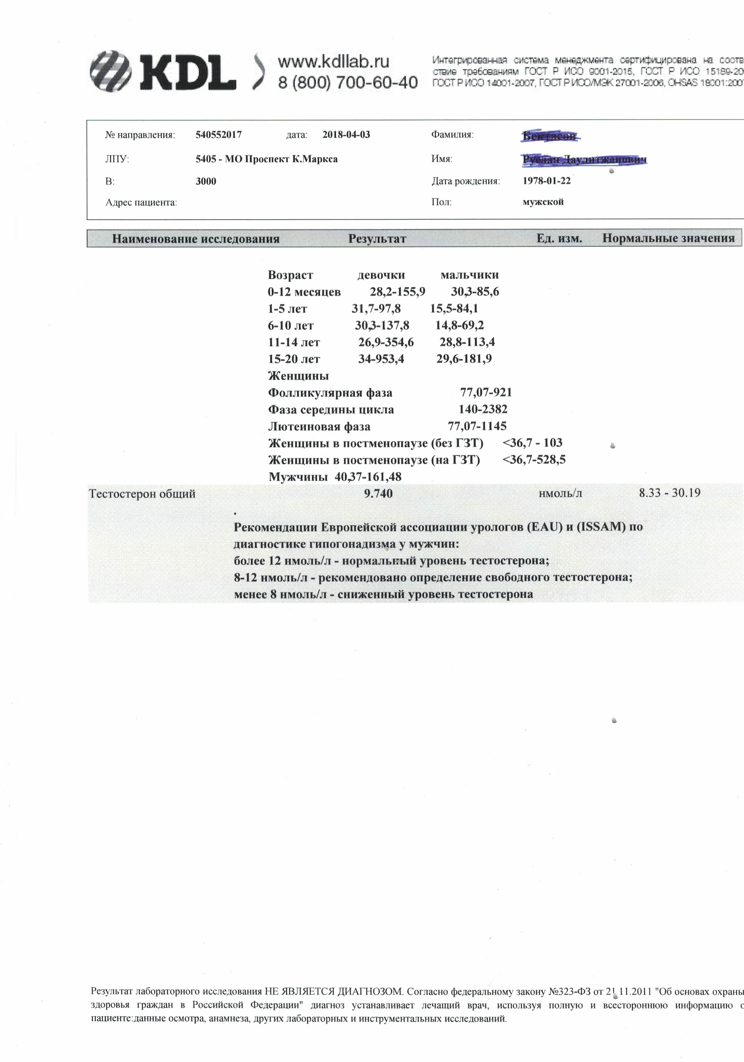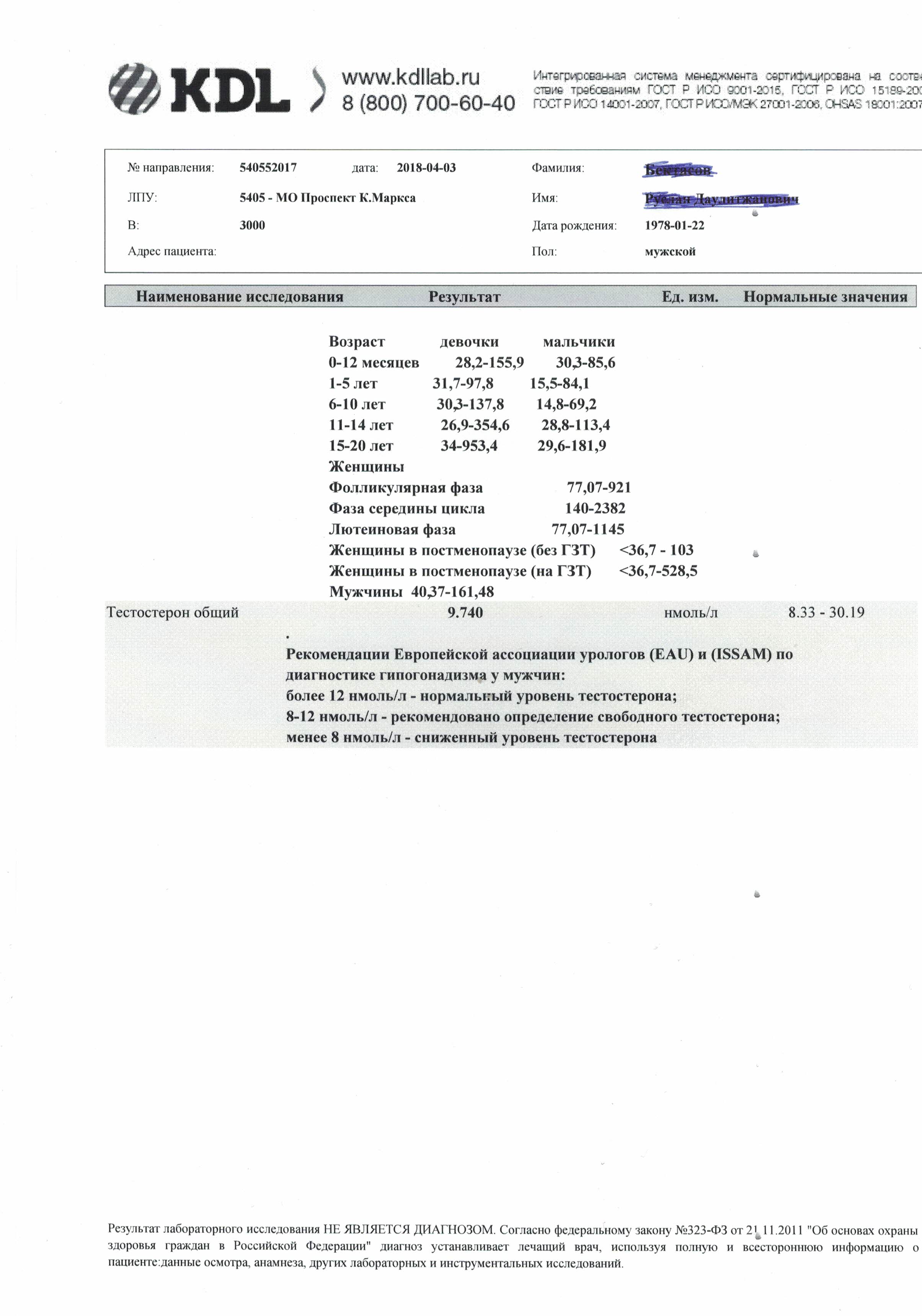 Тестостерон общий: 2,83 (РЗ: 72-853)*