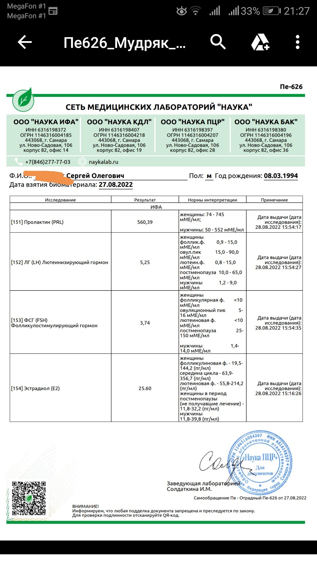 Ну вот и «сюрприз»(((( Говоришь все нормально у тебя? Блажен тот,кто верует. Гематокрит повышен,это очень плохо. Тестостерон,ниже плинтуса. Пролактин,под потолком. ФСГ,близок к плинтусу.