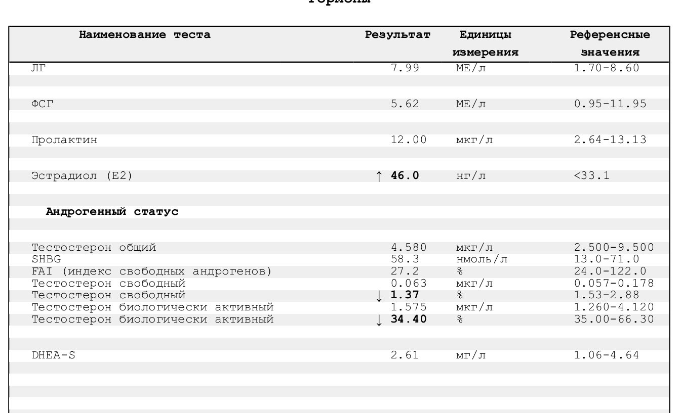 • Анализы гормонов: тестостерон общий\свободный, ЛГ, ФСГ, ГСПГ, эстрадиол, пролактин.