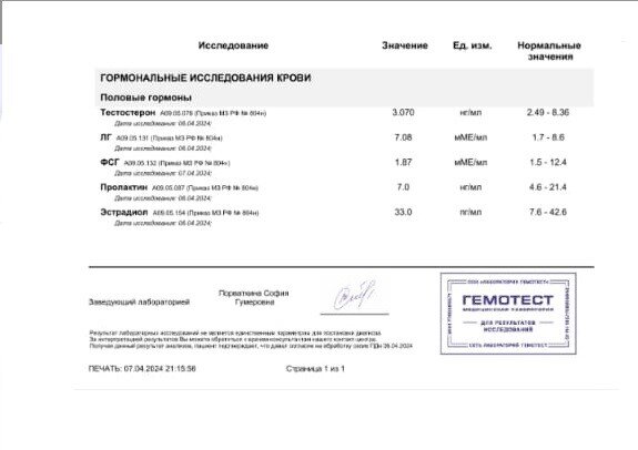 • Анализы гормонов: тестостерон общий\свободный, ЛГ, ФСГ, ГСПГ, эстрадиол, пролактин.