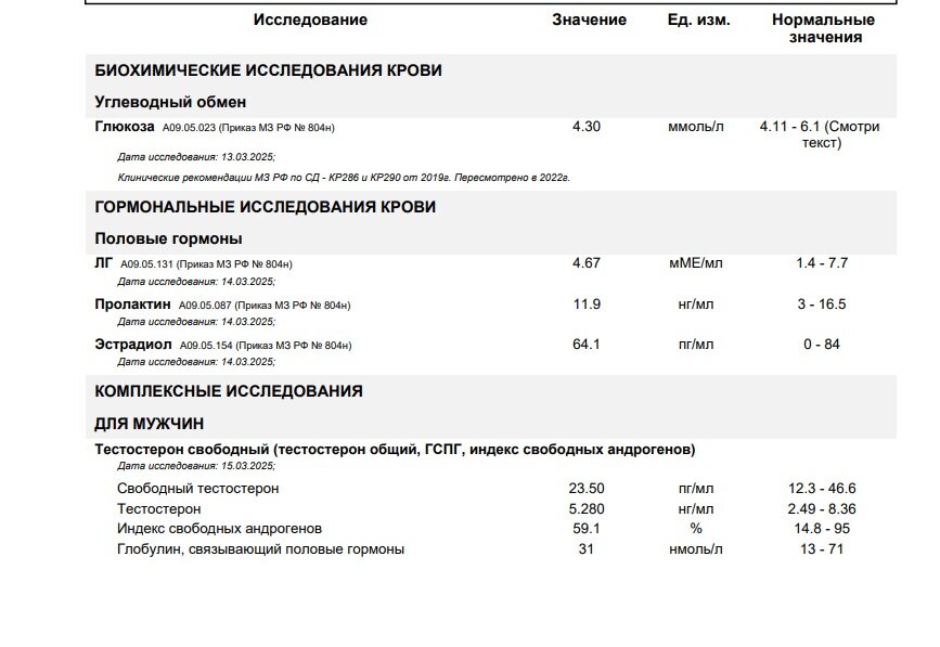 • Анализы гормонов: тестостерон общий\свободный, ЛГ, ФСГ, ГСПГ, эстрадиол, пролактин.