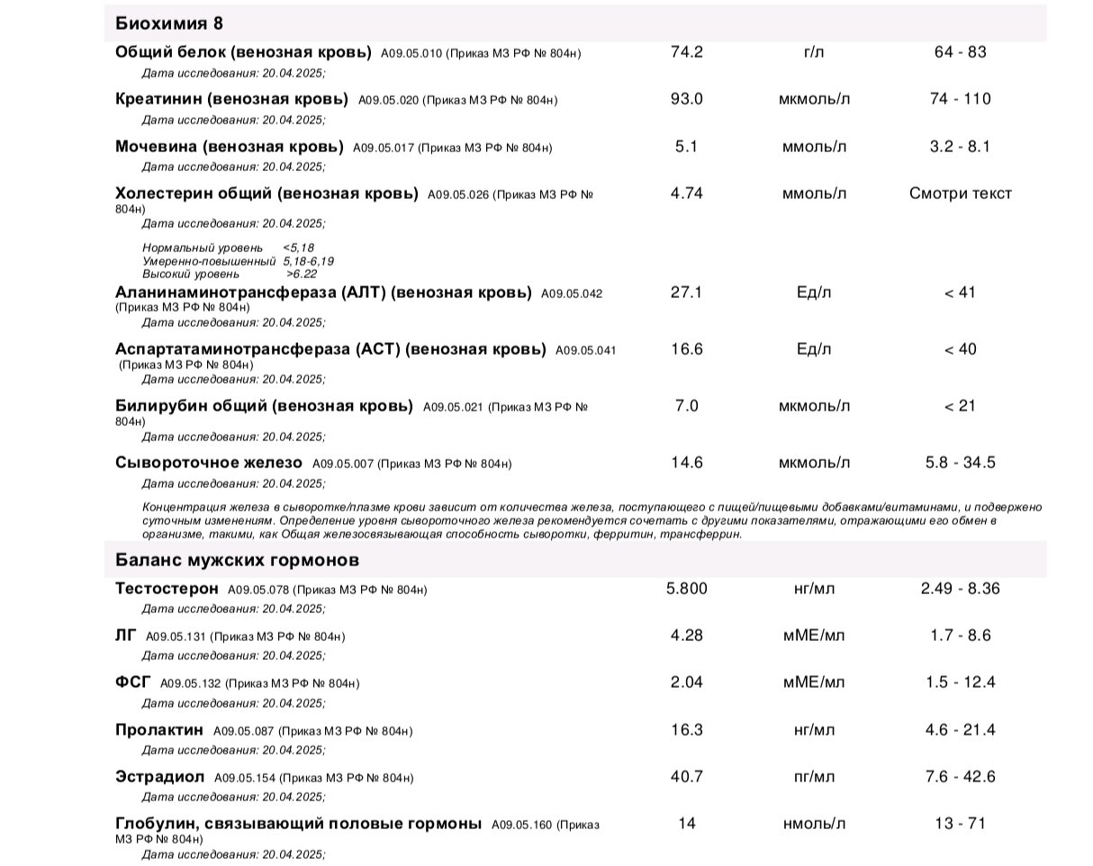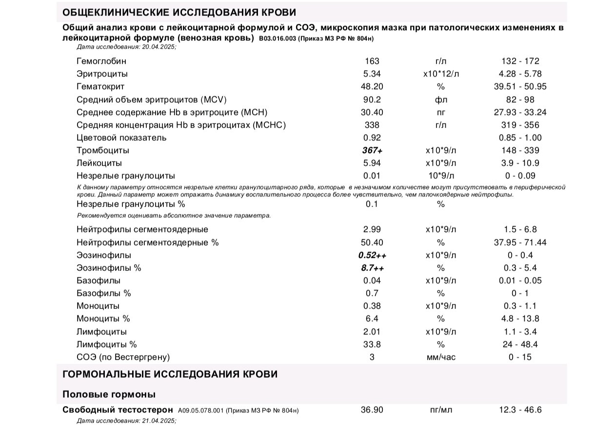 Доброго времени суток. 28 лет, рост 178, вес 99, заплывший жиром. стаж 4 года, год не занимался, сейчас месяц тренируюсь. Не курсил, бывало ел сармы лигандрол ибутаморен. Цель сушка. Эозинофилы повышены, так как сезонная аллергия на берёзу. Анализы сдал.