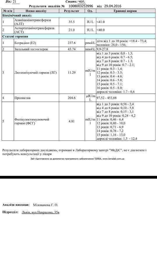 (Желательно иметь результаты анализов на половые гормоны) На данном этапе я здоров, планирую сдать соответствующие анализы к концу курса дабы сориентироваться по ПКТ.