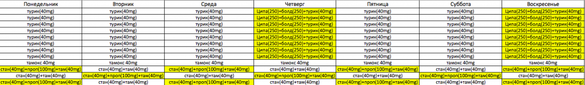 обираюсь принимать Т цепионат по 200мг раз в неделю, в середине недели. Тамоксифен, его со второй недели п30 мг в день. Выходить с Т пропионатом с 8 недели по 200мг раз в 2 дня.