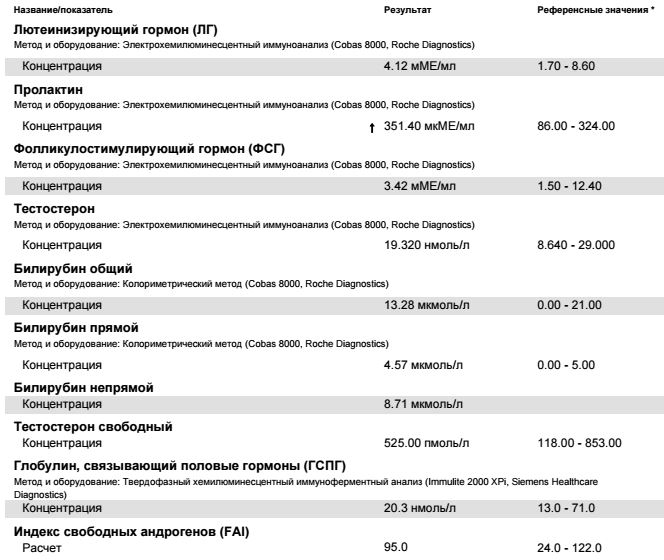 сследование Результат Референсные значения Комментарий АлАТ  38 ед/л < 41   АсАТ  36 ед/л < 37   Эстрадиол  58 пмоль/л 40 - 161 пмоль/л   Тестостерон   74.84 нмоль/л 8.9 - 42.0 нмоль/л Нижний диагностический порог, рекомендованный ISSAM: 12 нмоль/л Пролактин  259 мед/л 73 - 407 мЕд/л
