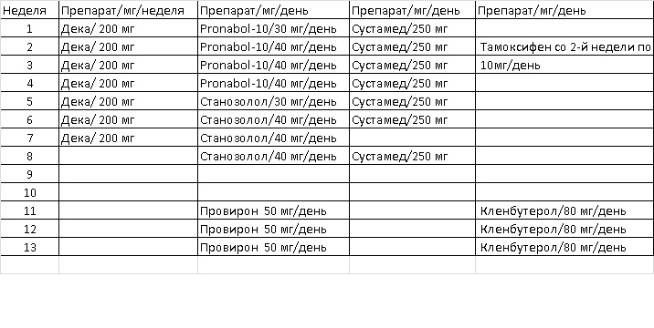Скоро курс, вот думаю, как правильно его составить, имеется 7 ампул деки, 7 ампул сустамеда, 100 таблеток метана, 100 таблеток станозолола, на ПКТ 20 таблеток провирона, 40 таблеток кленбутерола , тамоксифен ну и тестостероновые бустеры, креатин и.т.д.. Курс у меня будет четвертый, хочу растянуть на 8 недель, думаю, получится, так как не хочу пока употреблять в больших дозах. Стаж тренировок 3 года, 30 лет, рост 177, вес 86, жим 125, становая 140. Ниже я примерно нарисовал себе курс, посмотрите, что можно изменить, убрать или дополнить.