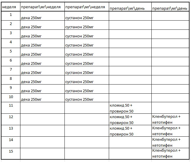 у меня был курс 10 недель , дека 250 , суст 500, 5 недель данабол 40 мг и 5 недель станазол 50мг, птк кломид, трибулус, цинк.. да на самом курсе с 6 й недели прокалол гонаду 3-и недели по 1000ме в неделю. говорят если на курсе есть дека то на птк лучше кломид и если деки 300 то суста надо минимум 500 в неделю.