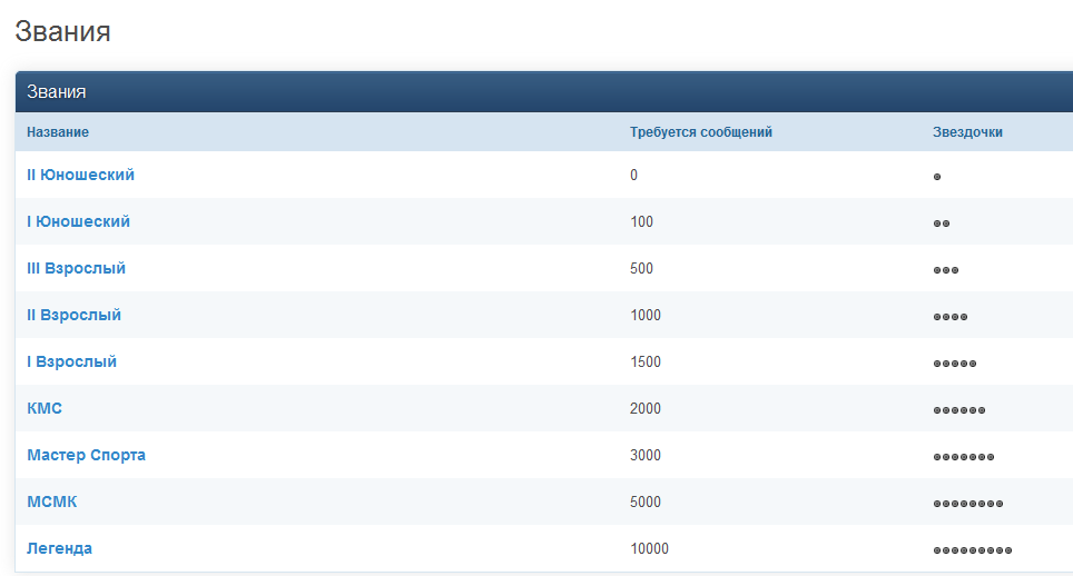 по сообщениям например вот так: 0 - 400 второй юношеский 400- 900 первый юношеский 900-1500 третий взрослый1500-2100 второй взрослый2100-2800 первый взрослый2800-3600 КМС3600-5000 МС5000+ МСМКпо репутации:узник концлагеря - 20турникмен - 10обычный 0опытный 20мастер 50чемпион 75ветеран 100потом можно будет еще придумать