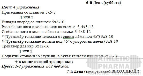 3. Вообще на курсе планировал заниматься 6 раз в неделю (6 дней подряд не через день), и разбить эту программу на 6 дней, примерно так: (большие мышечные группы через день и между ними малые мышечные группы)