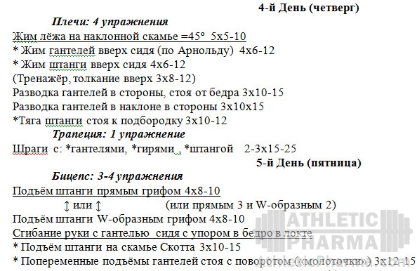 если не затруднит,какие будут рекомендации по питанию и процессу тренировок. сплит будет 5-и дневный.