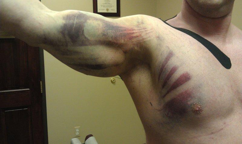 не в тех местах синее, я повреждения видел и у меня самого было) это либо просто пережал жимовой майкой и синяк, либо татуха)