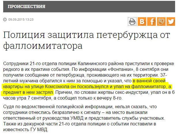 Метко он так поскользнулся  :bj:  нормальное оправдание. Самое интересное это магия чисел упал в 6 часов 7 сентября 8 сообщил а статья опубликована 9 (6789) вот и не верь теперь в нумерологию, вон что с людьми произойти может  :0367:  И все бы ничего но я одного не пойму чевой то он к мус...полиции обратился, обычно в таких случаях в скорую ну или в мчс на худой конец, загадка блин  :0367: Наверное в итоге мужик заявление написал на этот самый предмет на который якобы поскользнулся :0454:
