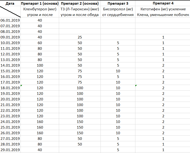 Потом начал увеличивать дозировки, добавил тироксин, кетотифен, бисопролол. (по скрину видно) Половину выпивал утром, половину после обеда.