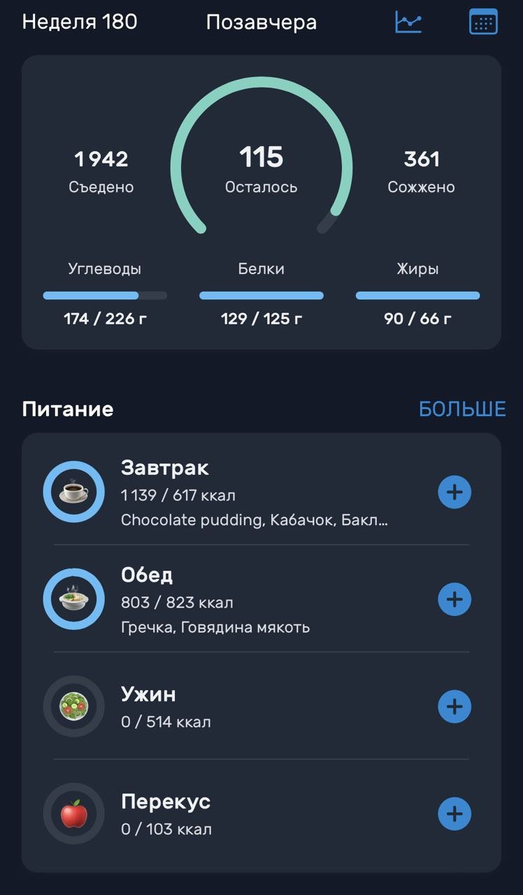 У меня по питанию вот как в среднем. В дни тренировок и повышенной активности добавляю еще 200-300 ккал в виде белка.
