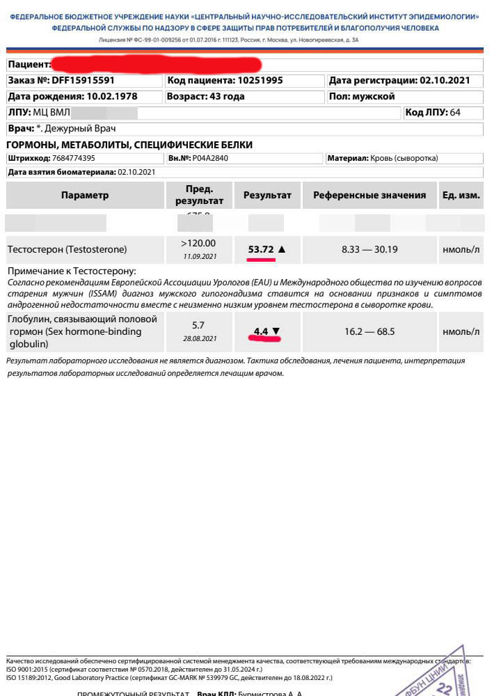 "Анализ сдан через 3 недели спустя сутки после инъекции 200 мг.Ставил с сустом в дозировке 750 и 400 трена.Каждая инъекция сопровождалась кашлем на помощь был «сальбутамол».Сон значительно сократился,желание заниматься в зале усилилось в разы.Препарат полностью рабочий!"