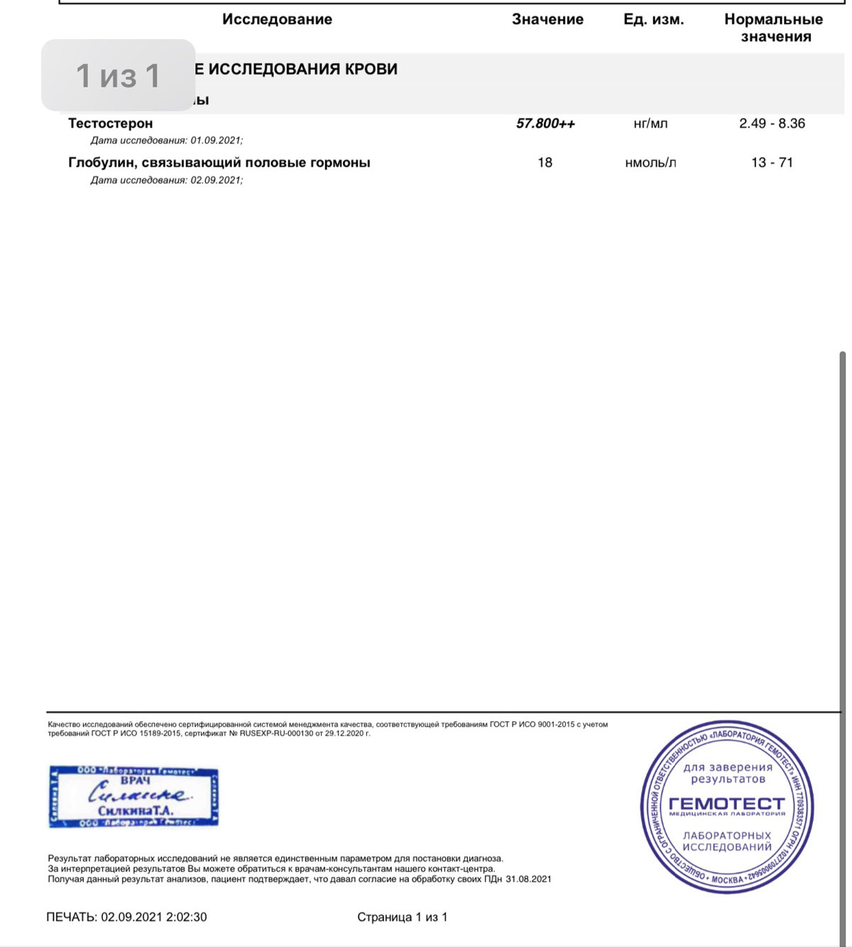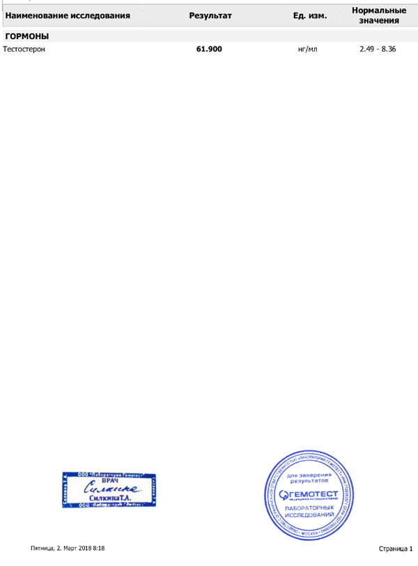 "Вот и анализ пришёл по тестостерону энонтату от Прайм Лабс , ставил по 750 в неделю ровно через 21 день сдал анализ через 24 часа , скажу масло отличное безболезненное , рекомендую."