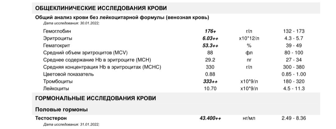 Гематокрит огорчает, учитывая слив месяца 1,5 назад. Но вероятно повлияло то, что я сейчас болею и очень сильно потею ночью. Народ сказал- обычная кровь для курса. Так что жить буду, надеюсь долго и счастливо!"