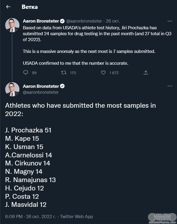 В этом году Иржи Прохазка, новоиспеченный чемпион UFC в полутяжелой весовой категории, на собственной шкуре ощутил пренебрежительное отношение USADA по отношению к спортсменам. Как сообщил репортер TSN Аарон Бронстетер, только за последний месяц чешский боец прошел 24 (!) проверки на допинг от Американского антидопингового агентства. А общее число сделанных им допинг-тестов за 2022 год достигло рекордной отметки в 51 раз (!). В списке подконтрольных USADA спортсменов Иржи Прохазка с огромным отрывом занял первое место по этому показателю. Для сравнения: вторую строчку по количеству проверок на запрещенные препараты делят его коллеги по UFC, – Камару Усман, бывший чемпион полусредней весовой категории, и Манель Капе, представитель наилегчайшего веса, не выходивший в октагон с декабря 2021 года. На их счету по 15 допинг-тестов.