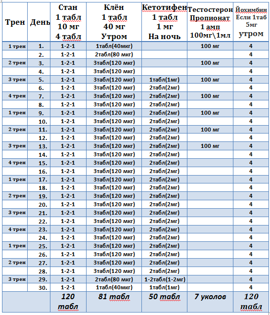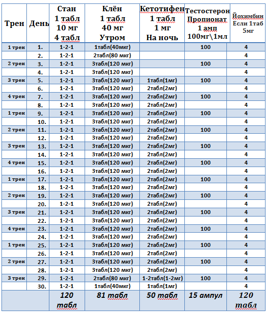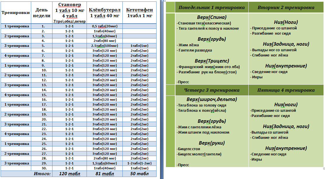Курс приёма становер+клнбутерол+кетотифен и график тренировок, тренировки проходят в режиме 3х15-20.