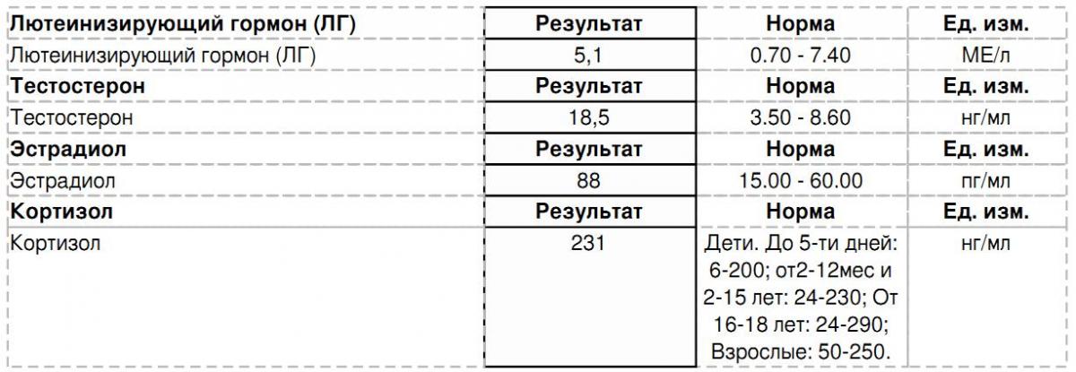 Кортизол 30 (норма 50-250),Лютеинезирующий гормон 3.2 (норма 0.7-7.4), Тестостерон 5.2 (норма 3.5-8.6), Эстрадиол 68 (норма 15-60).