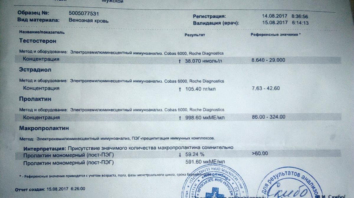 Анализы спустя 2 недели приема анастрозол 1таб каждый день; 0.5таб каберголина 2раза/неделя: