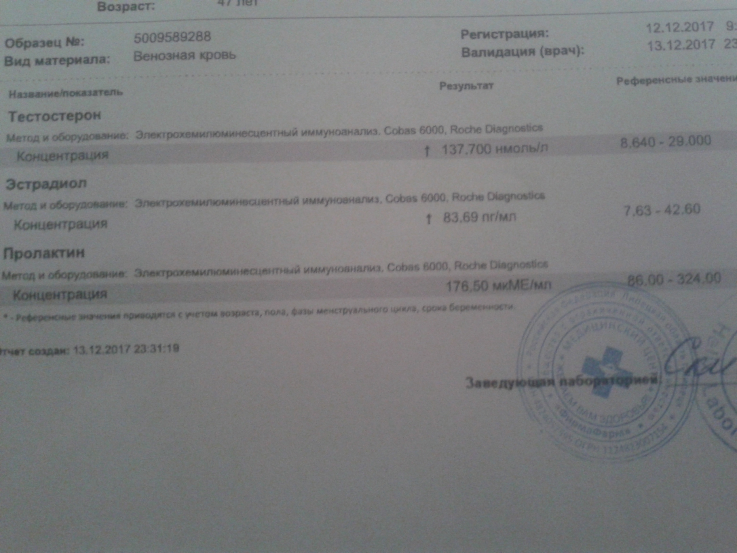 Иммунохимия ( Architect, Abbott lab.S.A.) Тестостерон общий 12,35 нг/мл 1,66 - 8,77 Иммунохимия (Сobas , Roche Diagnostics) Эстрадиол 409,10 пмоль/л 28,00 - 156,00