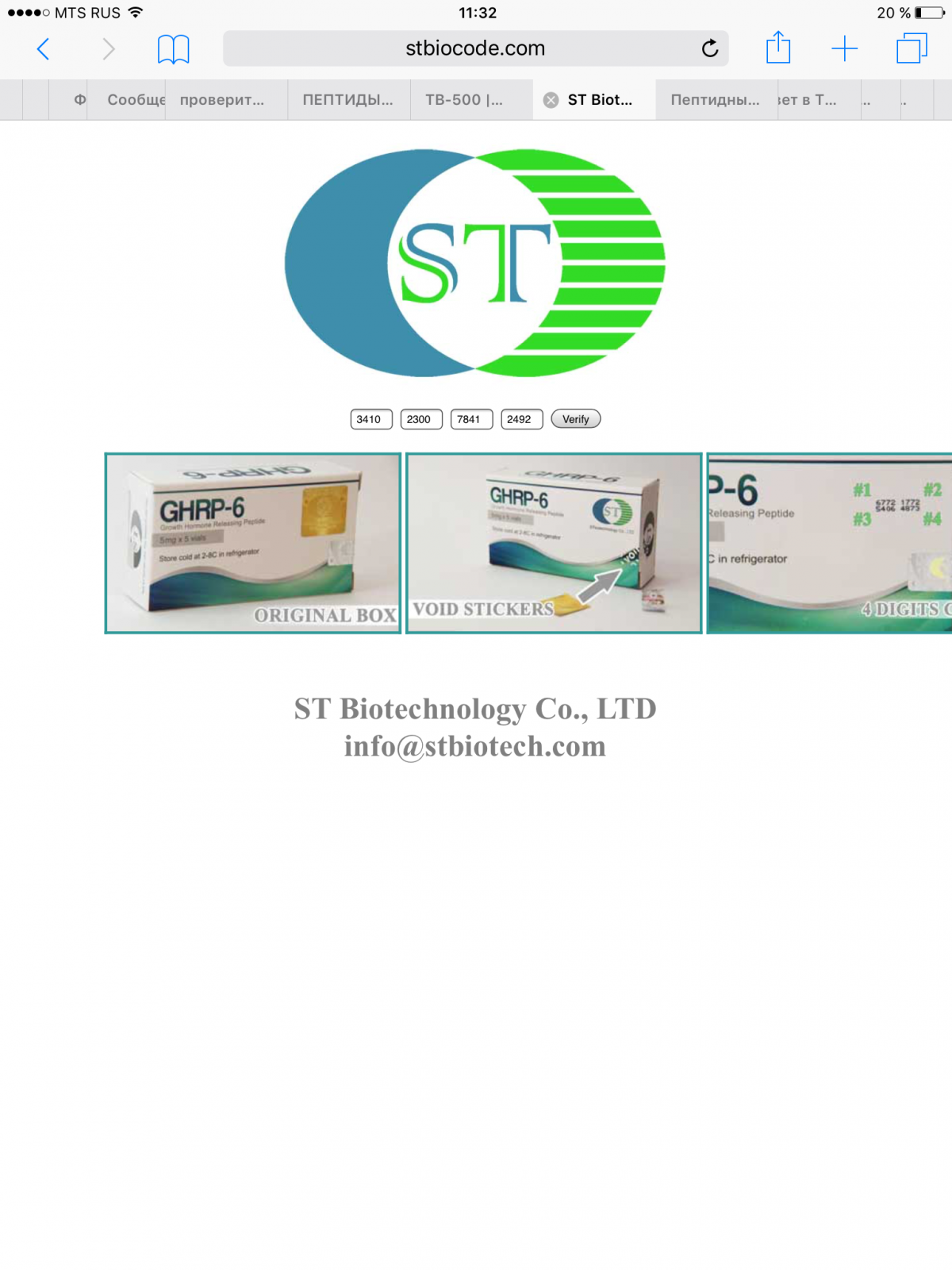 Пептиды производства "St Biotechnology Co" из последних партий можно проверить по коду на оригинальность (в старых партиях подобная система защиты отсутствовала). Код находится на коробке под голографической наклейкой. Также на коробке с новым препаратом обнаруживаются два воид-стикера (защита от вскрытия). Если коробку открыть, то на месте такого стикера останется надпись “void”, указывающая, что коробку открывали.